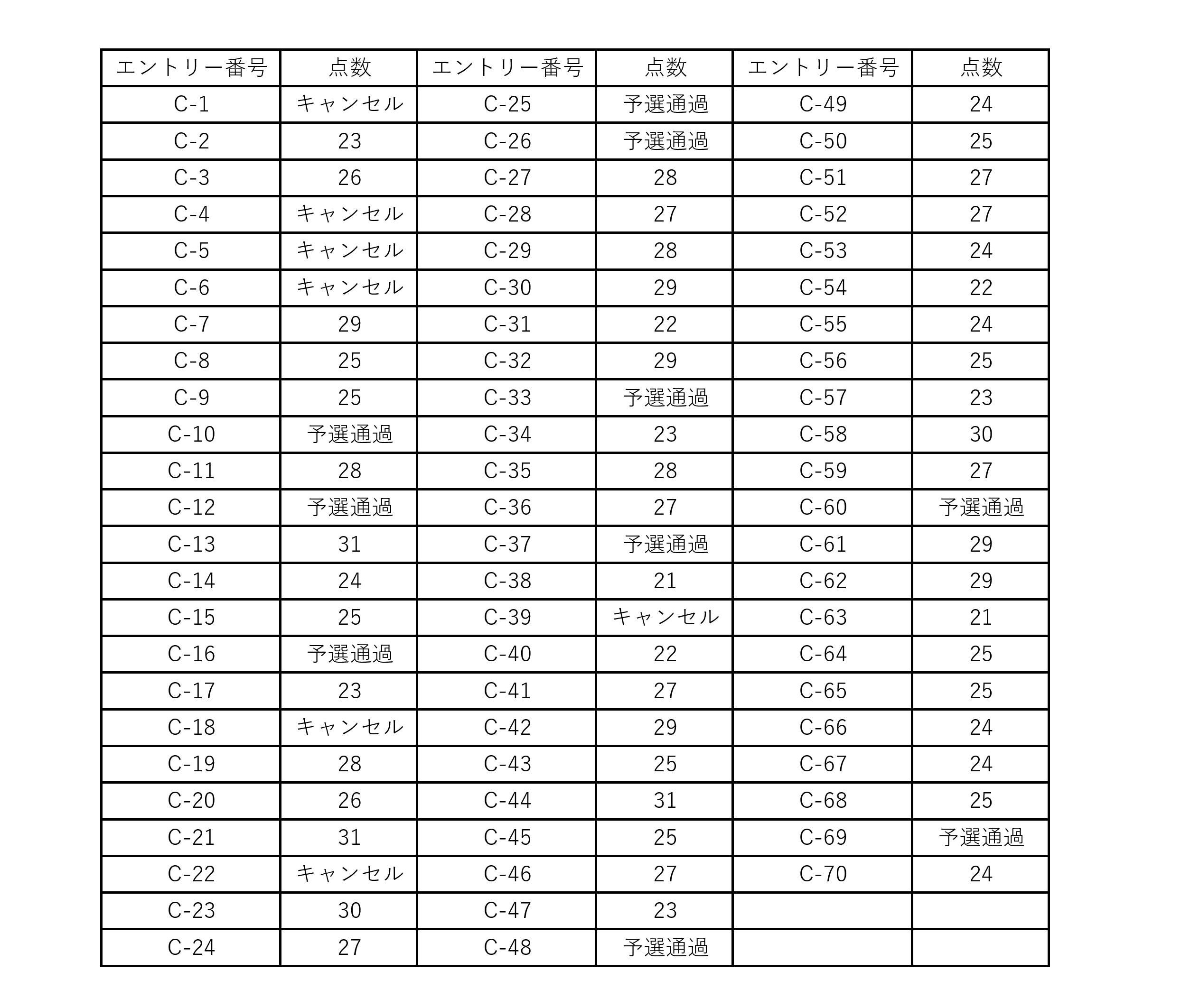 また、得点は低い方が上位となります。(記載されている得点は点数を加算した数になります。なお順位はより細かい数字が算出される乗算点数で決定しています)